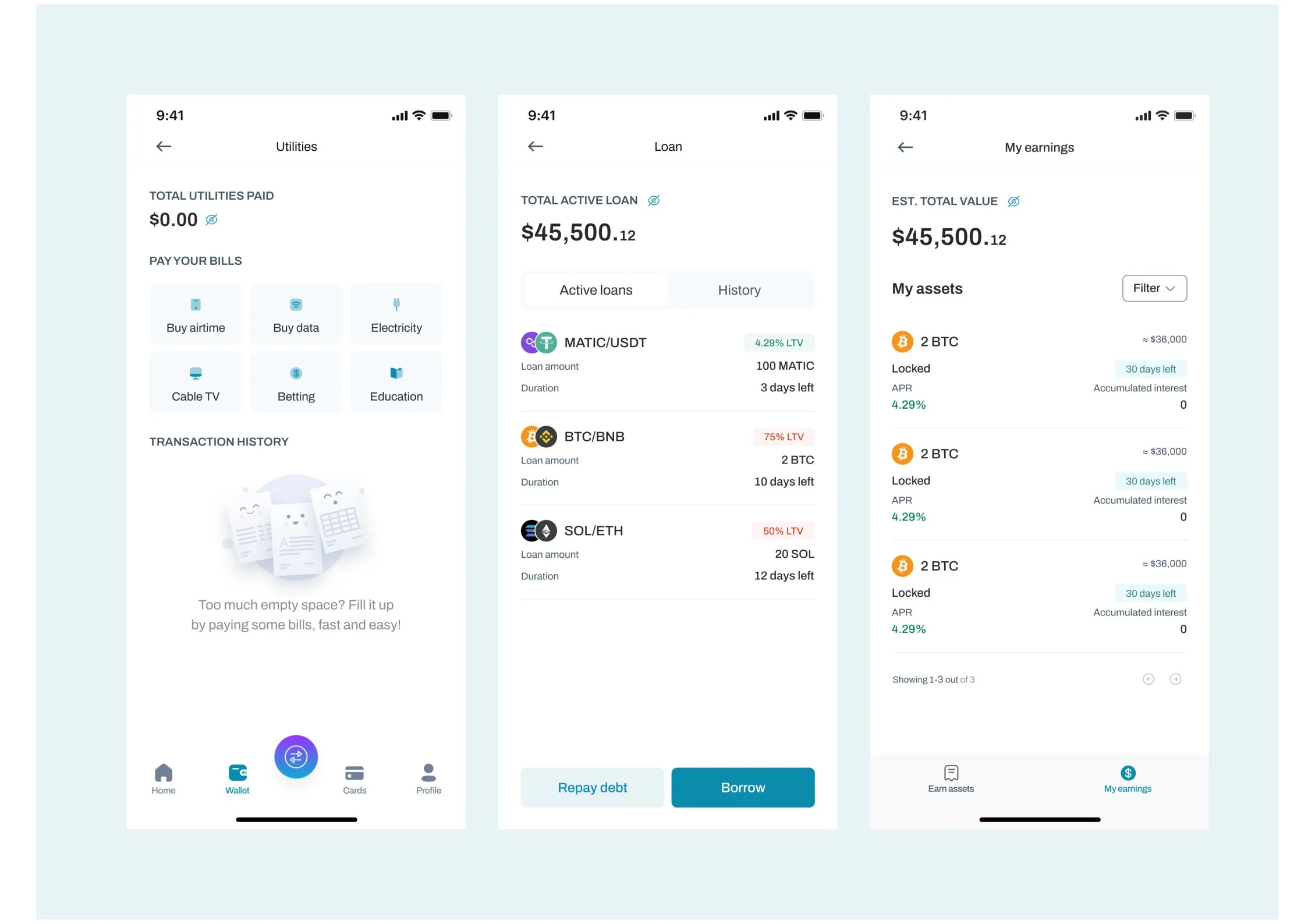 Additional Features: Features such as Utilities, Earn and Loan are included to enable users to pay for their utility bill with crypto, earn profit on locked investments and also take out loans all in cryptocurrency.