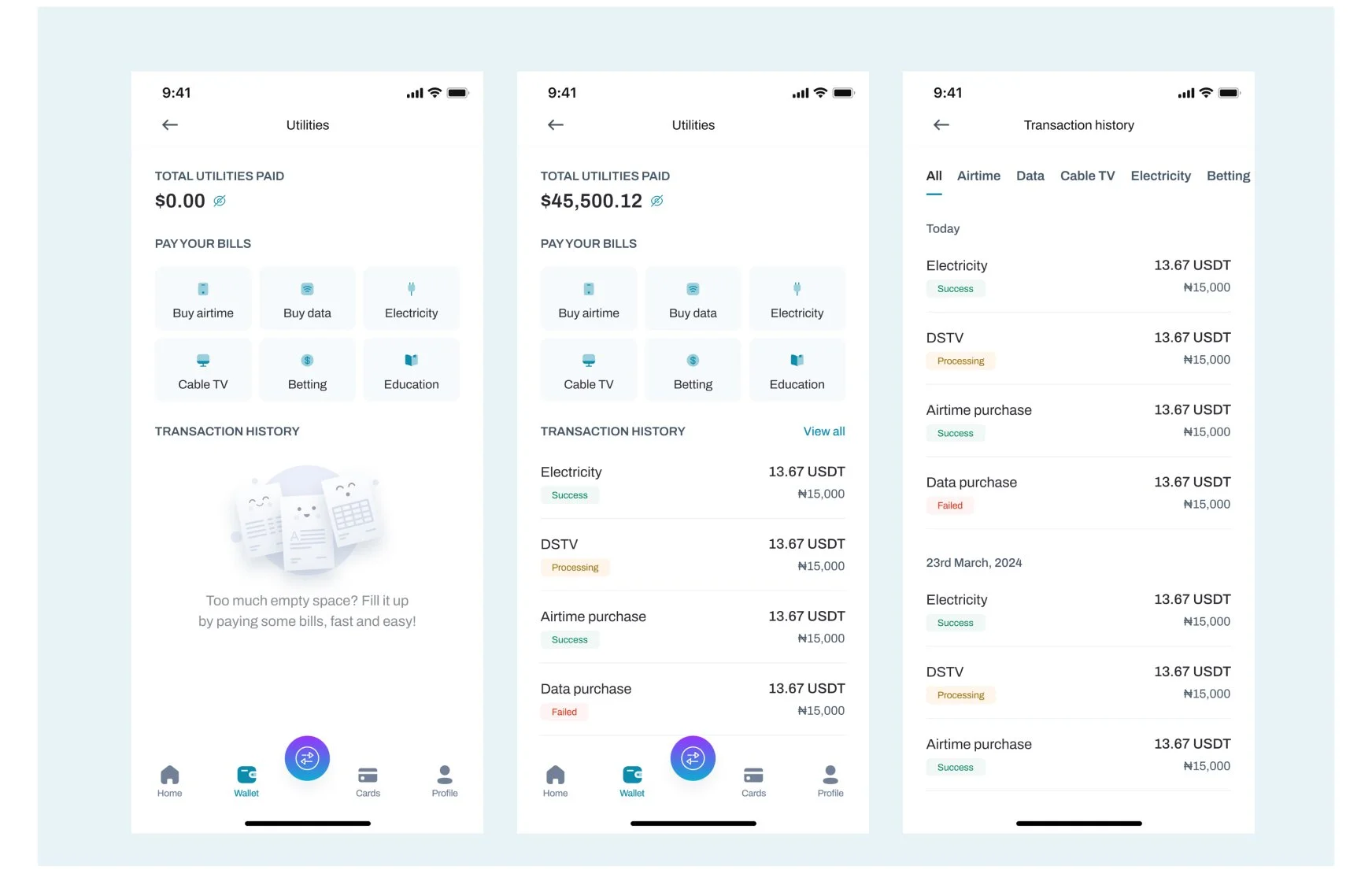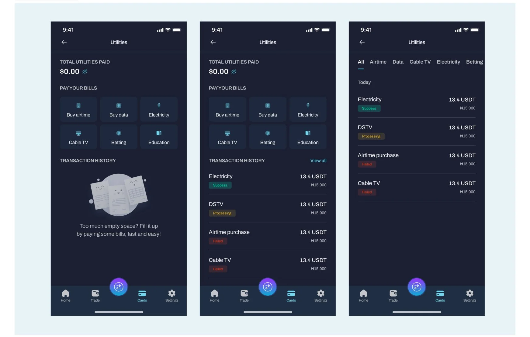 Utilities Feature: Introducing the a Obiex Utility feature. Now you can ditch the traditional bill payment routine and experience the convenience of paying your bills directly from your crypto wallet.